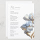 This bas relief wedding menu card features light blue and gold 3D textured lily flowers and an elegant handwritten script on a white background.