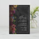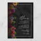 Leve os arranjos florais em cores brilhantes e quentes, que vão do coral e do rosa rosa a ouro amarelo, combinam-se com fundos vigiados e obsidianos para dar às peças desta elegante suite de casamento uma ambência escura e modesta. Este menu de recepção de casamento apresenta uma borda lateral de flores, uma estreita estrutura branca sobre um fundo preto e uma modelo para adicionar facilmente as seleções de menu, os nomes e a data do casamento. Procure ID829 para ver a coleção completa.