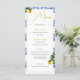 Bellisimo Eleve seu dia especial de casamento com este italiano inspirado elegante azulejo azul italiano e o menu de casamento dos limões botânicos de cor dourada. Um design muito elegante. Um design personalizado com suas informações é facilmente inserido no modelo. O design eterno de limões ensolarados e azulejos azuis invocam uma vibração de verão para o seu dia especial. Torne este design exclusivo seu.