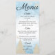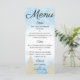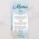 Este menu elegante e festivo mostra um fundo branco no centro com um padrão de gelo azul congelado nas porções superior e inferior. Um tema de inverno impresso num design de brilho branco marfim. Os pinheiros são apresentados perto do fundo do menu e vários flocos de neve estão espalhados ao redor do fundo. O texto é impresso em uma fonte elegante e sofisticada que você pode personalizar para incluir suas próprias opções de jantar. A parte traseira do menu apresenta um design de gelo correspondente com a mesma imagem de inverno impressa sobre a parte superior.