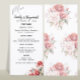 This elegant wedding menu card features a sophisticated botanical aesthetic that balances traditional romance with a clean, modern layout. It is a perfect choice for couples seeking a refined, timeless look for their reception tables. The right side is adorned with a delicate watercolor bouquet of soft pink and white peonies, accented by deep red berries and dusty blue eucalyptus-style leaves.