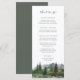 Aumente sua recepção de casamento com este cartão de menu lindamente projetado da coleção Timberline pela Redwood & Vine Design Co. Apresentando uma ilustração de floresta verde pintada manualmente e montanha, este menu vertical adiciona um toque de encanto rústico e elegância refinada às suas configurações de mesa. Com tipografia minimalista e espaço amplo para listar cada curso, é ideal para casamentos no inverno, espaços florestais ou celebrações ao ar livre nas montanhas. Totalmente personalizável para corresponder ao seu menu e estilo de casamento.