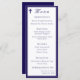 Design front features a white background to the image of a cross in top left corner. Heading is displayed in an elegant font in top center. Following the traditional format for a wedding menu, all text is customizable and displayed in a navy-blue font. Entire design is framed by a navy-blue and white border.
