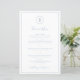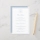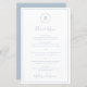 Simples cardápio de casamento azul empoeirado com seu monograma em um círculo no topo e suas opções de cardápio cercado por uma borda fina. O cabeçalho e seus nomes estão em uma fonte elegante de script manuscrito. O layout clássico e tradicional faz deste menu excelente para um casamento no inverno formal. Esses menus baratos de casamento são impressos em folhas de papel para uma opção econômica.