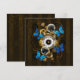 Composição do relógio de aço redondo com discagem numérica romana preta, decorado com engrenagens de ouro e latão, borboletas morfo azuis e lentes danificadas sobre fundo listrado castanho. Estilo Steampunk.