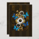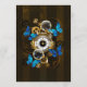 Composição do relógio de aço redondo com discagem numérica romana preta, decorado com engrenagens de ouro e latão, borboletas morfo azuis e lentes danificadas sobre fundo listrado castanho. Estilo Steampunk.