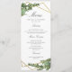 Este cartão de cardápio é a adição perfeita ao seu básico de casamento! Este design apresenta um verde botânico de cor aquática e uma estrutura geométrica de folha de ouro falso com um na moda e uma tipografia moderna com opções de "Menu" e comida. Esta carta se reverte para um fundo verde escuro com um delicado padrão botânico.