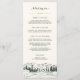 O nosso casamento cômico ou menu de eventos especiais apresenta os seus cursos iniciais, entretenimentos e sobremesas acentuados com uma ilustração esboçada de picos de montanha, pinheiros e um rio fluido, com "menu" no topo em letras elegantes de caligrafia. Coordena-se com a nossa coleção de casamentos do Mountain Sketch.
