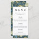 Enfoque decorativo de safra e tipografia moderna, carta elegante de cardápio de casamento. Menu apresenta um padrão têxtil antigo em inglês em tons elegantes de azul, esticado e champanhe. Projetado para combinar com nossa antiga Coleção de Casamentos de Jardim Inglês.