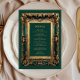 Este elegante cardápio de casamento apresenta um ornamentado verde-vintage e um quadro dourado sobre e esmerald verde na imitação de um antigo cobrir de livro. Personalize o texto decorativo dourado com os detalhes do menu. O design de quadro é repetido na parte traseira da placa.