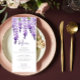 Este design de cartão de menu apresenta elegantes flores de wisteria de aquarela em lavanda macia e roxo com folhas verdes sobre um fundo branco com o seu menu personalizado abaixo. O texto pode ser personalizado editando as caixas de texto. A cor no verso do menu pode ser alterada no editor. Projetado para você pelo Evco Studio © em www.zazzle.com/store/evcostudio #casamento #menu #menucard #wisteria #watercolor #wedinginspiração #botânico #foliage #floral #flores #elegante #na moda #moderno #design #popular #topsellers #topsellers #topseller #trending #wintercasamento #summerncasamento #autumncasamento #florertemor #noivado #stationery #personalizado #destino personalizado #destino formal #celebrações clássicas #branca #lavanda #lilac #violet #roxo #função #partidarismo #partidarismo