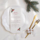 Menus de casamento festivos com dois arranjos de coloração d'água bagas holly vermelhas e folhas verdes. Personalize com seus nomes e data de casamento em vermelho e cardápio.