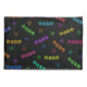 Um padrão para os amantes de gatos com a palavra "meow" escrita com uma letra de pata num arco-íris de cores em fundo preto. Gatinho bonito e colorido rostos completos.