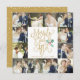 Espalhe o amor e mostre suas fotos de casamento nesta temporada de festas com este cartão de saudação de colagem de fotos de feriado e Recem casados moderno. Perfeito para o casal recém-casado usar como anúncio de casamento ou cartões de agradecimentos em torno dos feriados. Este cartão põe as suas belas fotos de casamento em bom uso, apresentando uma única grade de colagem de 12 fotos, perfeita, combinada com um guião de ouro festivo que diz "Merrily Ever After" e nossa coloração d'água pintada à mão. No verso, adicione a sua própria mensagem personalizada, que é realçada por uma imagem divertida de neve/floco de neve.
