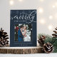 Cartões com fotos elegantes para recém-casados apresentam uma foto de casamento quadrada favorita em um rico fundo azul da meia-noite, com "Merrily Ever After" em um roteiro de caligrafia branca. Personalize com seus nomes ou saudação personalizada abaixo. Uma borda tonal em flocos de neve completa a aparência. Perfeito por compartilhar uma foto de casamento para seu primeiro Natal casado.