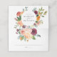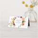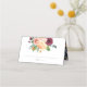 Estes cartões de casamento de outono apresentam flores bonito a aquarela, incluindo rosas, dahlias e botões de borboleta. A frente do cartão de lugar inclui um buquê floral de outono acima de um lugar para escrever o nome do convidado e o número da tabela. No verso, um círculo floral rodeia o nome do casal e a data do casamento. A parte inferior do cartão de casamento apresenta um fundo azul marinho e um padrão floral bonito.