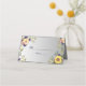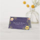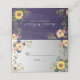 Cartão de casamento elegante, moderno, boho, botânico, púrpura de madeira rústica com nome e número de mesa, flores a aquarela, girassóis e verde.