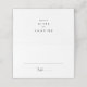 Este simples cartão de casamento minimalista é perfeito para um casamento moderno. O design simples e elegante apresenta a tipografia de scripts clássicos e ricos em preto e branco. Personalize a parte de trás do cartão de lugar com os nomes da noiva e do noivo e a data.