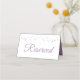 Estas belas cartas de lugar são uma forma excelente de deixar seus convidados saberem quais lugares são reservados para familiares e outros convidados especiais. Projetado como parte de nossa Suíte Casada Elegante de Roxos e Cinzas. Possui um design simples, mas elegante, com texto roxo lavanda sobre fundo branco com borda floral de folha de papel prateada.