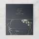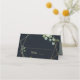 Este cartão de casamento verde-azul de ouro geométrico é perfeito para um casamento moderno. A design apresenta lindas folhas verdes pintadas manualmente em um fundo azul escuro, enfeitando uma armação geométrica dourada. Personalize a parte de trás do cartão de lugar com os nomes da noiva e do noivo e a data.