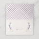 Criado para combinar com a coleção de anúncios de nascimento "Sweet Floral", este cartãozinho dobrado apresenta espaço para o nome do convidado e o número da mesa, emoldurado por uma grinalda de flores e folhas delicadas. O interior do cartão tem espaço para uma mensagem personalizada, e o verso do cartão apresenta um padrão xadrez roxo desenhado à mão. Este cartão de lugar é perfeito para chás de bebê, bem como chás de panela e casamentos.