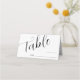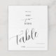 Cartão de lugar de número de tabela mínimo e simples para o seu casamento com uma fonte moderna de script que diz "mesa" com uma linha de vazio onde você pode preencher o número da tabela e o nome do convidado. Você pode adicionar os nomes da noiva e do noivo nas costas.