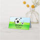 Cartões de lugar mostrando uma bola de futebol e uma bola de futebol de bebês, grama verde e um céu azul. Todas as palavras podem ser personalizadas.