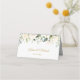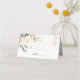 Cartão de lugar elegante com ilustração de rosas brancas, folhagem verde e ouro floral em estilo aquoso.