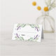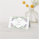 Um moderno e elegante. Um fundo branco decorado com flores de lavanda, flores e verde de eucalipto. Personalize e seus nomes. Adicione seus nomes de convidados e seu número de tabela manualmente.