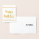 Este simples cartão de saudação de aniversário de folha de ouro apresenta a mensagem "Feliz Aniversário!" na frente, juntamente com uma mensagem personalizável no dentro. Pode ser dado a alguém que comemora um aniversário.