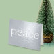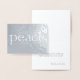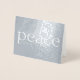 com um fundo de folha de alumínio e um texto de recorte branco curvado, este cartão de feriado brilha com uma mensagem simples e esperançosa de paz numa fonte elegante. Dentro deste cartão na moda dobrado, você pode personalizar uma mensagem e adicionar seus nomes. a parte traseira do cartão apresenta o ano. deixe a paz brilhar