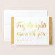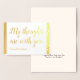 Esta simples design de cartão de saudação de simpatia em folha de ouro mostra a mensagem "Meus pensamentos estão com você" na frente, junto com uma mensagem personalizada no dentro. Um cartão como este poderia talvez ser utilizado para oferecer simpatia aos familiares de alguém que morreu recentemente.