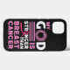 Texto cor-de-rosa e branco "Meu Deus é mais forte que o cancer mamário".