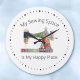 Este relógio de costura é perfeito para sua costureira ou colcha favorita. Imagem de uma máquina de costura estilhaçada, colorida, com padrão de retalhamento, é legendada "My Sewing Space Is My Happy Place". Você pode editar o texto para suas próprias legendas, se desejar. Não é utilizada no produto nenhuma costura dimensional ou coloração. Parece melhor nas cores claras