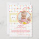 Um convite unisex da foto para o partido do Agra Hadig do seu bebê. As bolinhas coloridos são cobertas com uma banda amarela que caracteriza um dente e uma circular, scalloped, janela da foto. O cartão é fácil de personalizar com seus fraseio, pia batismal, cor da pia batismal e escolha de seis tipos de papel.