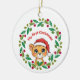 Este adorável ornamento apresenta um guepardo bonito cercado por uma coroa festiva de Natal enfeitiçada com amoras sagradas. Perfeito para a primeira decoração de Natal de um bebê, enquanto a design bonitinha traz um espírito de feriado alegre para a comemoração do pequeno.