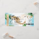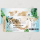 Cartão de embarque para casamento na praia, destino no México, avião dourado, salve a data com coração e ícone de avião com folhas tropicais