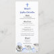 Uma coleção de conchas marítimas desenhadas à mão sobe a borda deste Menu. Uma cruz azul enfeita o topo. As costas têm um padrão marinho para completar o tema. Faça check-out ou armazene a irmã www.pixieprints.com para todas as suas necessidades de convite!