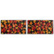 Autumn Midnight, mostra um padrão vibrante de folhas do outono em um fundo preto. As folhas são uma mistura de tons vermelhos, laranja, amarelo e dourados, representando uma variedade de espécies como carvalho, carvalho e castanheiro. "o contraste entre as cores vívidas das folhas e o fundo escuro cria um efeito marcante e dramático, enfatizando os tons quentes e o detalhe intrincado da folhagem. folhas menores, bolotas e galhos são espalhados ao longo, acrescentando profundidade e textura ao padrão. A design tem um sentimento enérgico e festivo de uma noite viva de outono.