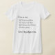 Pais — especialmente mães de trabalho — sempre vestiram muitos chapéus, mas 2020 não lhe deu tempo para vestir muitas CAMISAS! O Design mostra uma lista de verificação das suas atividades domésticas durante estes dias de bloqueio pandêmico e TODOS são verificados. Camisa de treino? Cheque! Camisa de teletrabalho? Cheque! Camisa de professor da escola? Cheque! Camisa de dormir? Cheque! Esta camisa faz tudo! Além disso, um pedido: "Não me julgue."