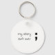 Um simples chaveiro branco que diz "a minha história não acabou" com um ponto e vírgula.