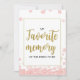 Este sinal de chá de panela moderno com "Minha memória favorita da noiva" apresenta um fundo floral rosa com respingos de glitter dourado. O texto é escrito em uma mistura de uma fonte de caligrafia divertida e uma fonte sans moderna. Cartões personalizados de memória favorita da noiva estão disponíveis.