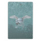 Betoneira azul-cinza com asas, picareta e pá.