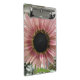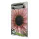 Esta incrível miniprancheta mostra uma bela fotografia de um girassol rosa pálido. O girassol é naturalmente cor-de-rosa e as pétalas têm um anel exterior cor-de-rosa claro e um anel interior rosa escuro. O meio onde estão as sementes é preto. Esta fotografia foi tirada num jardim.