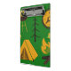 Uma pequena prancheta para colocar todos os seus planos de acampamento. Ele tem desenhos fofos de acampamento como grelhador, tenda, bússola, fogueira, e até mesmo árvore de abeto.