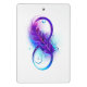 Símbolo infinito com uma bela pena pintada em cores roxas e azuis brilhantes sobre fundo branco.
