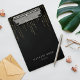 A área de transferência dinâmica apresenta duas linhas de texto personalizado em letras brancas clássicas em um plano de fundo preto rico, com linhas verticais de linhas de carateres de folha de ouro falsas em cascata a partir do topo. Design repete-se no lado oposto. Observe que esta área de transferência é um tamanho mini; a versão do tamanho do cheio também está disponível em nossa coleção Marquee Dourada.