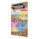 Um design bonito e vibrante com uma folha de papel falso, com escovas de arco-íris brilhantes, cheias de brilho dourado falso que parece brilhar e brilhar. Um falso quadro de borda geométrica de escala dourada tem modelos na frente e atrás para sua redação personalizada. Estes são perfeitos como favores a lápis. Equipe-o com a etiqueta e o lápis correspondentes e entregue aos seus convidados.
