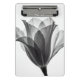 A close-up, monochrome photograph showcases a tulip flower against a bright white background. The flower's petals are delicately rendered, with visible veins adding texture. The image captures the flower from a low angle, emphasizing its upward reach. The stem is slender and dark, contrasting with the lighter petals. The overall mood is serene and elegant, highlighting the flower's natural beauty.