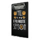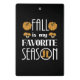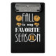A pequena abóbora marrom, cogumelo, e as ilustrações das botas-de-chuva e o grande texto: Queda é a minha estação favorita.